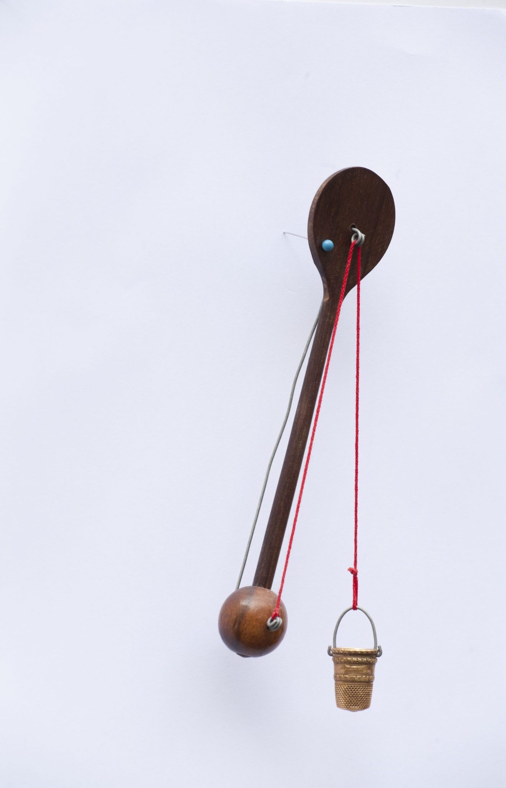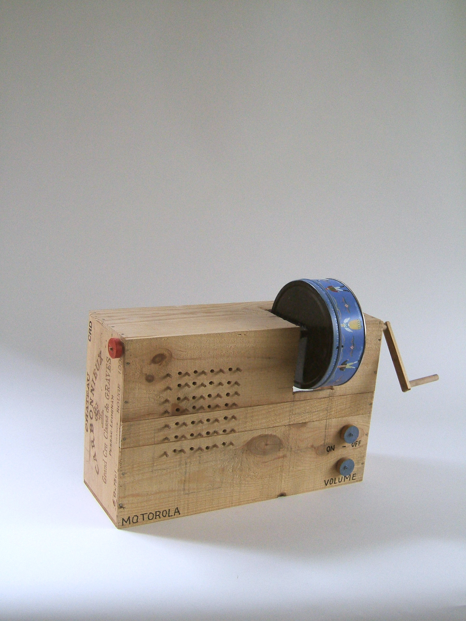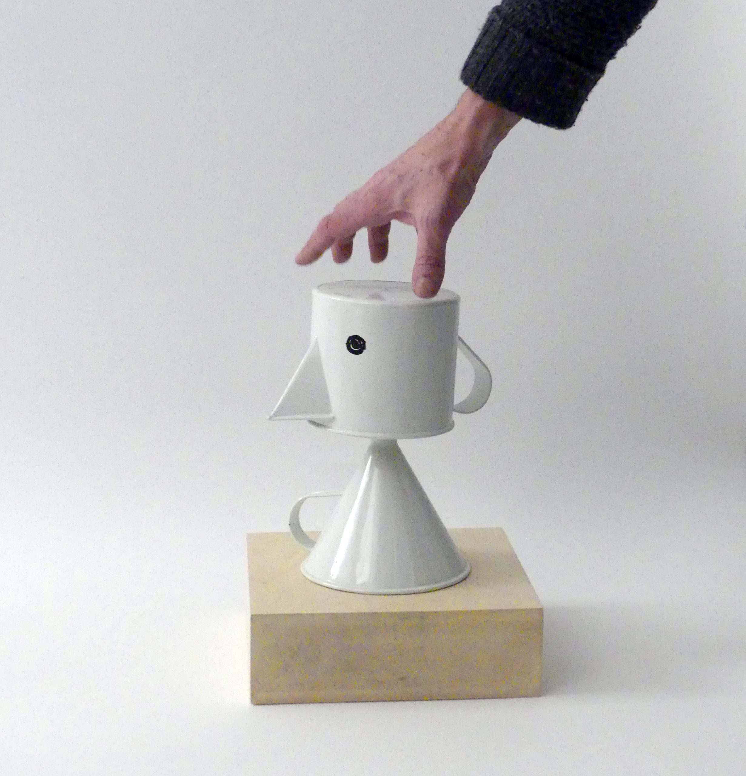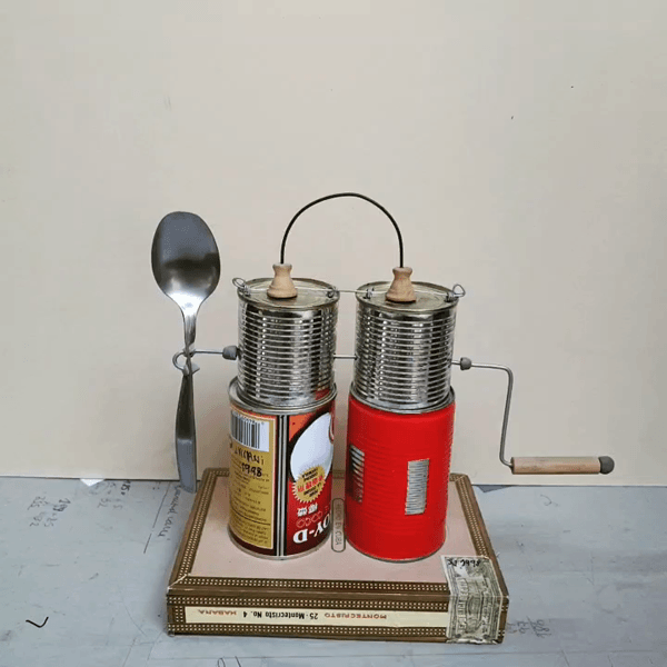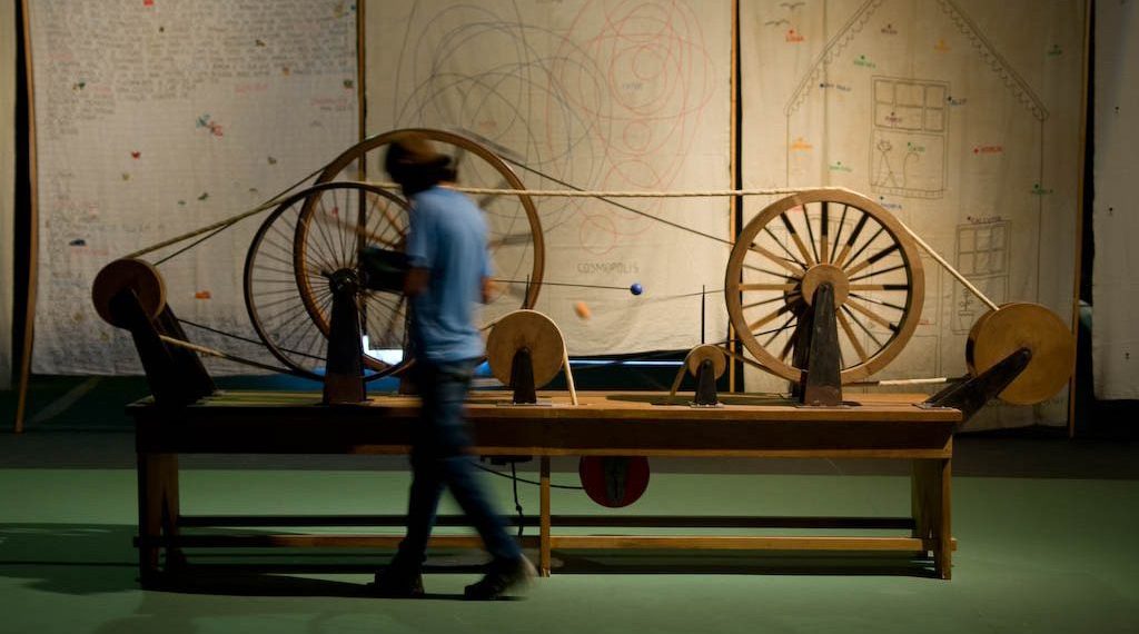 Le jeu de l’annulation est ici à son comble : un mouvement réel détermine un mouvement non moins réel, mais immobile – ce qui s’appelle faire du surplace, exercice bien connu des coureurs cyclistes sur piste qui, à leur insu, pratiquent une forme de dialectique négative. Pour Villani, ce n’est certes pas à son insu. Histoire d’ajouter un peu de loufoquerie, il a superposé à la roue qui fait danser les chaussures une boîte en fer blanc de biscuits, à la manière d’un tambour. Or ce tambour ne sert absolument à rien. Il est, selon l’expression consacrée, d’une splendide inutilité. D’autant plus splendide qu’à l’idée des chaussures qui n’avancent pas peuvent être associées bien des légendes et des fables, histoires de flâneurs ou de professeur Tournesol, de statues et de fantômes, d’illusions et de désillusions. Vous croyez bouger ? Vous ne faites que vous en donner la réconfortante apparence.