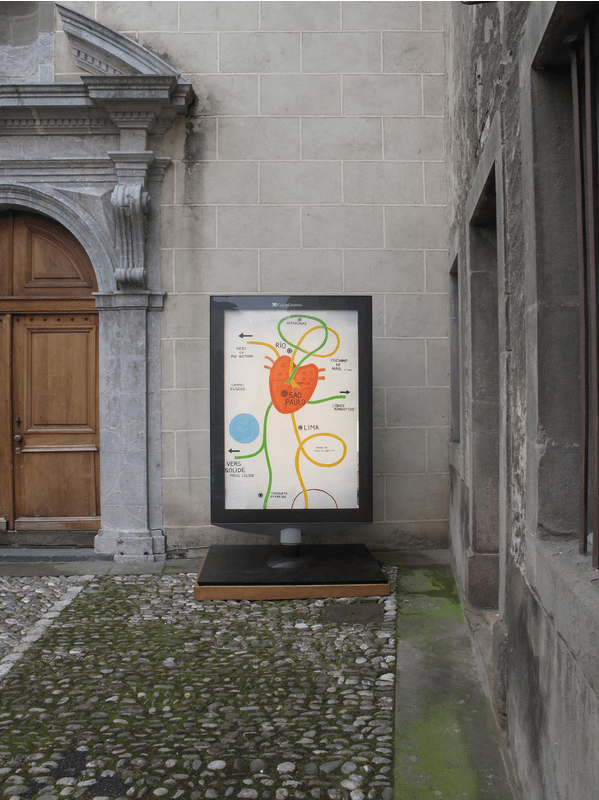 La troisième machine est d’un genre légèrement différent, bien qu’elle se présente comme deux boîtes – grandes boîtes vitrées à usage des annonceurs publicitaires – équipées de systèmes de rotation qui font défiler des affiches. Ici, ce ne sont pas des affiches qui défilent mais des rouleaux sur lesquels Villani a dessiné sa vie sous forme de planches anatomiques. Les artères et les veines y figurent les voies de circulation, les organes des villes et des idées. C’est simple – de cette évidence qui fait se demander pourquoi aucun artiste n’y avait songé avant lui, tant le détournement du matériel de réclame est habile et efficace. (Et qui se plaindrait que ce matériel serve enfin à autre chose qu’à la promotion d’un film hollywoodien, d’une bière ou d’une ligne de sous-vêtements pour adolescentes ?)