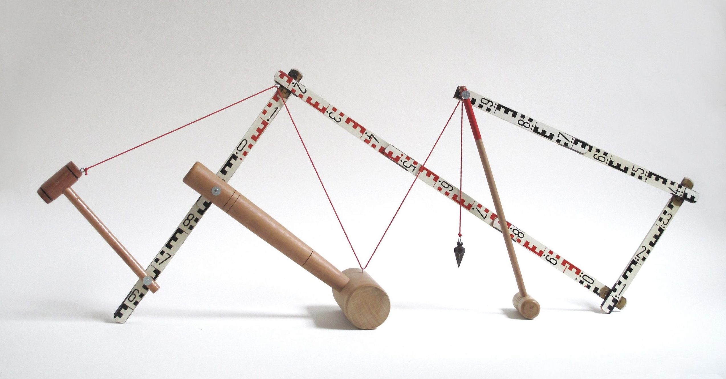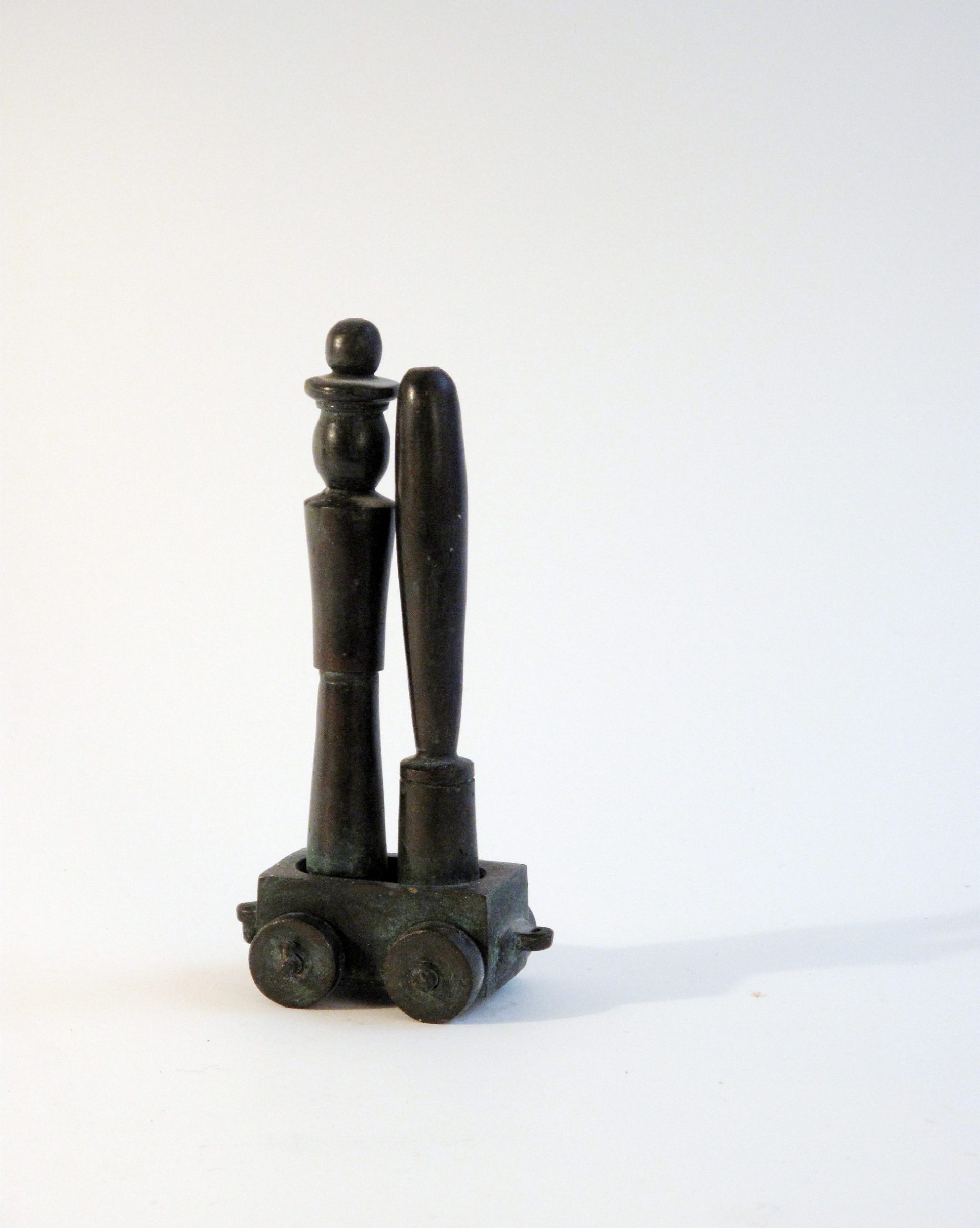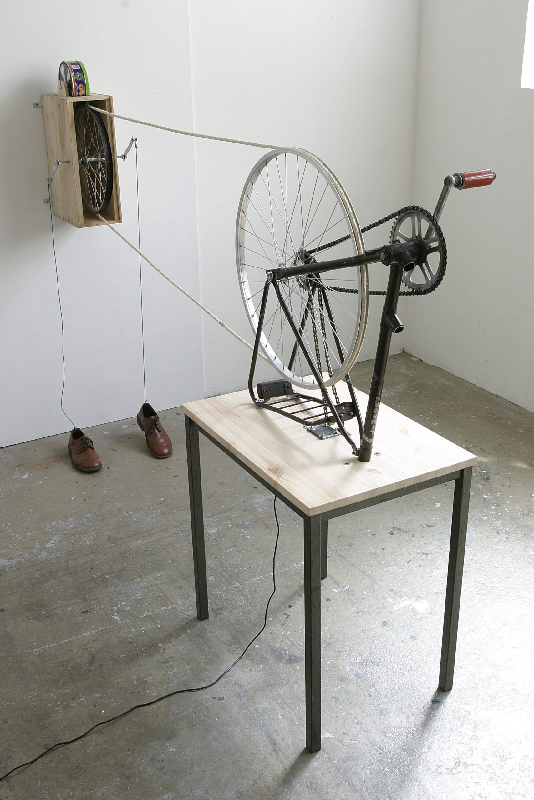 Une autre machine, évidemment célibataire et duchampienne, est celle qui marche pour rester sur place – à nouveau la dialectique de la mobilité prise à revers. Elle se compose d’une table et d’un tabouret. La table porte une roue arrière, un pédalier et un cadre de bicyclette scié. Sur le tabouret, Villani a fixé une boîte en bois qui contenait des bouteilles et à l’intérieur une deuxième roue plus petite. Aux deux extrémités du moyeu, à l’extérieur de la boîte, deux ficelles sont attachées, dont l’autre bout est noué à deux chaussures, masculines, cuir fauve, plutôt chic. Appuyer sur les pédales entraîne la chaîne et la grande roue dont la rotation est transmise par une courroie à l’autre roue, rotation qui fait marcher les chaussures – les fait piétiner plutôt puisque ni la longueur de la ficelle, ni le dispositif général ne peut leur permettre de gagner ne serait-ce que quelques centimètres. Elles sont condamnées à marcher sans avancer, jusqu’à l’épuisement de celui (ou celle) qui pédale à l’autre bout de la chaîne. Cette construction est à la fois savante et idiote, dans la continuité revendiquée de la roue de bicyclette de Duchamp tournant au-dessus du tabouret, ready-made légendaire dont Villani a eu l’audace de s’emparer.