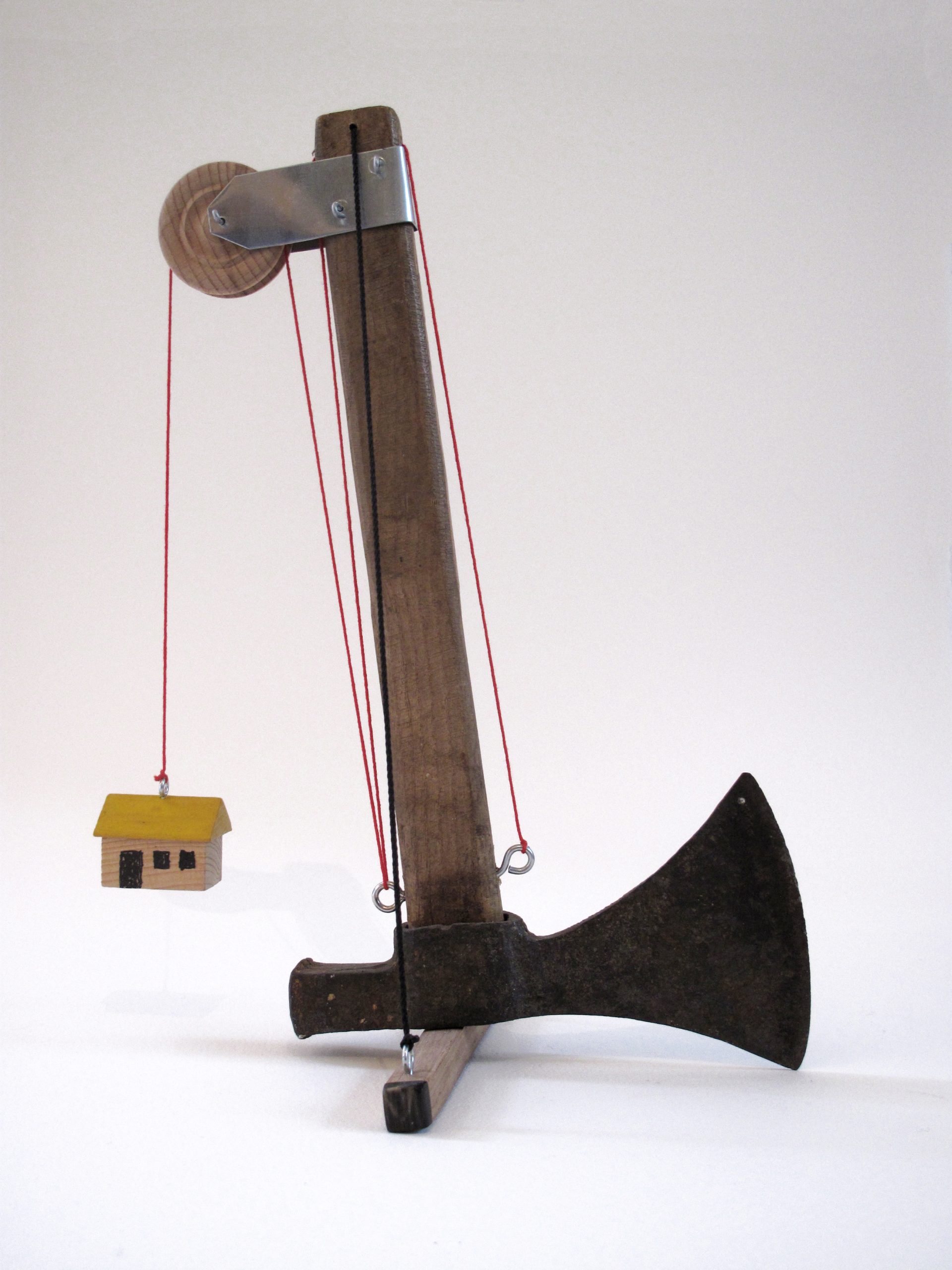 La plus simple est évidemment celle d’une insulte faite au moteur, dont les efforts réguliers et la conception technique impeccable se trouvent frappés d’impuissance à cause d’une ficelle. On y verrait volontiers la revanche du rudimentaire sur le complexe. D’autres exemples du même affrontement seraient les dégâts causés par une branche entre les rayons d’une roue, d’un peu de sable dans un carburateur ou d’un peu d’eau dans un circuit électrique. Ces incidents devraient rappeler à chacun la terrible fragilité des indestructibles machines. Une deuxième réflexion n’est guère moins évidente : l’architecture, que Villani aime migrante, se montre ici, à l’inverse, in déplaçable, contrariant le dispositif qui devrait la promener inlassablement sur le tapis de caoutchouc noir. Ce pourrait être une façon de suggérer que la maison est partout la même et que le changement n’est qu’une apparence. Pour un artiste qui vit de part et d’autre de l’Atlantique, le symbole serait assez éloquent. La troisième irait dans la même direction : que le mouvement ne soit pas perceptible alors même que sa réalité ne peut être mise en cause, la vie quotidienne des hommes le démontre. Ils savent que leur planète tourne et n’en ont pas moins l’impression que leurs maisons sont immobiles, retenues par des ficelles invisibles en dépit de la rotation de la sphère terrestre sur son axe.
