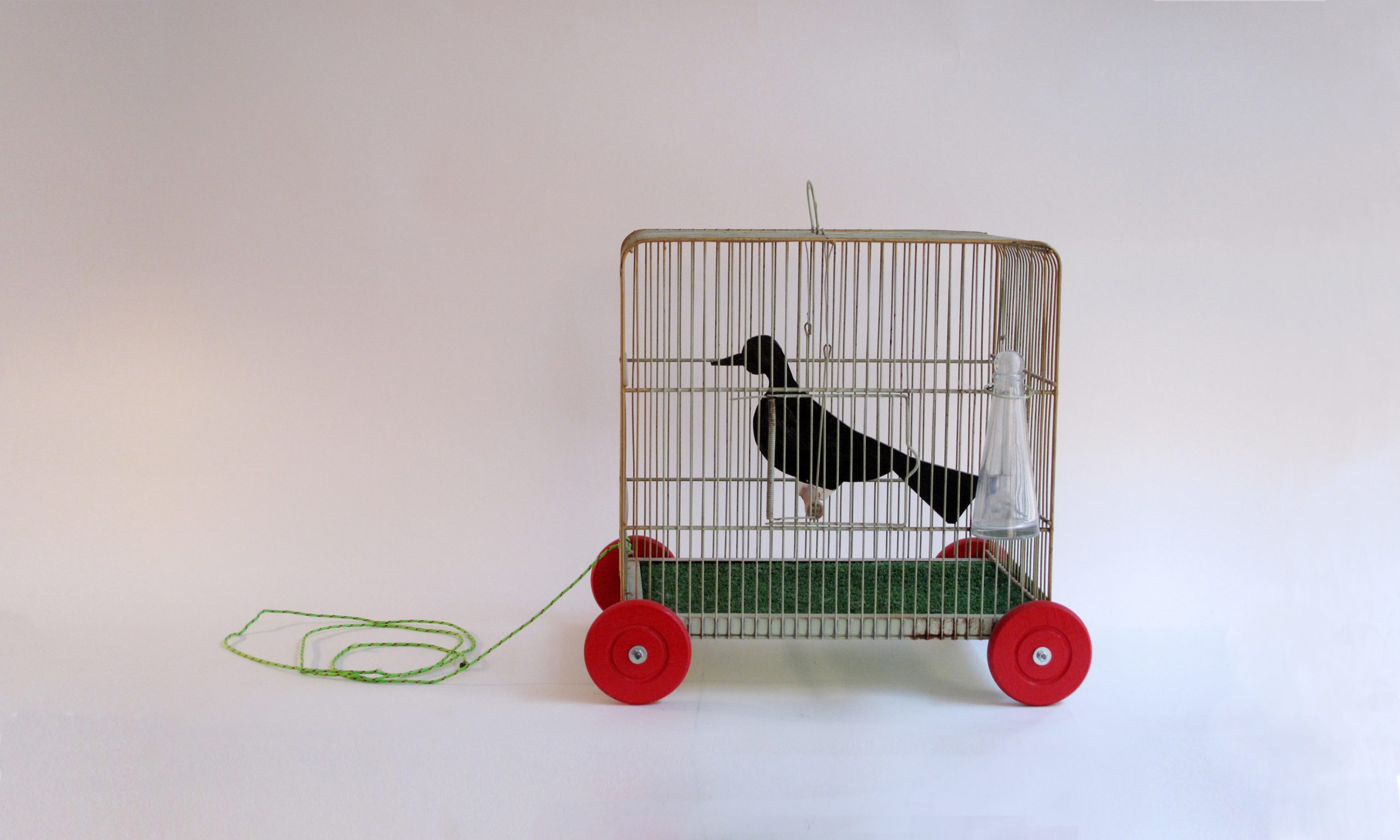 Dans ce registre, l’ingénieur Villani propose des articles dont l’absurdité poétique ne peut manquer de laisser perplexe. L’une d’elles est une machine mobile pour rester immobile. Composée d’un tapis roulant – avec ses cylindres d’entraînement et son moteur- et d’une maison en bois peint rouge et jaune, elle présente cette particularité que le tapis roule pour rien sous la maison qui reste immobile par le seul pouvoir d’une ficelle. Parmi les hypothèses d’interprétation qui peuvent être suggérées, on en retiendra trois.